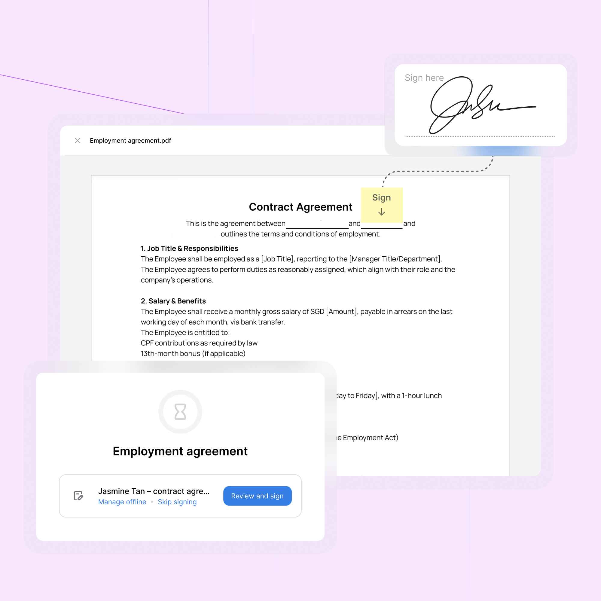Generate compliant, ready-to-sign employment contracts directly from the platform. Choose digital signatures for instant execution or download for offline signing – your workflow, your way.