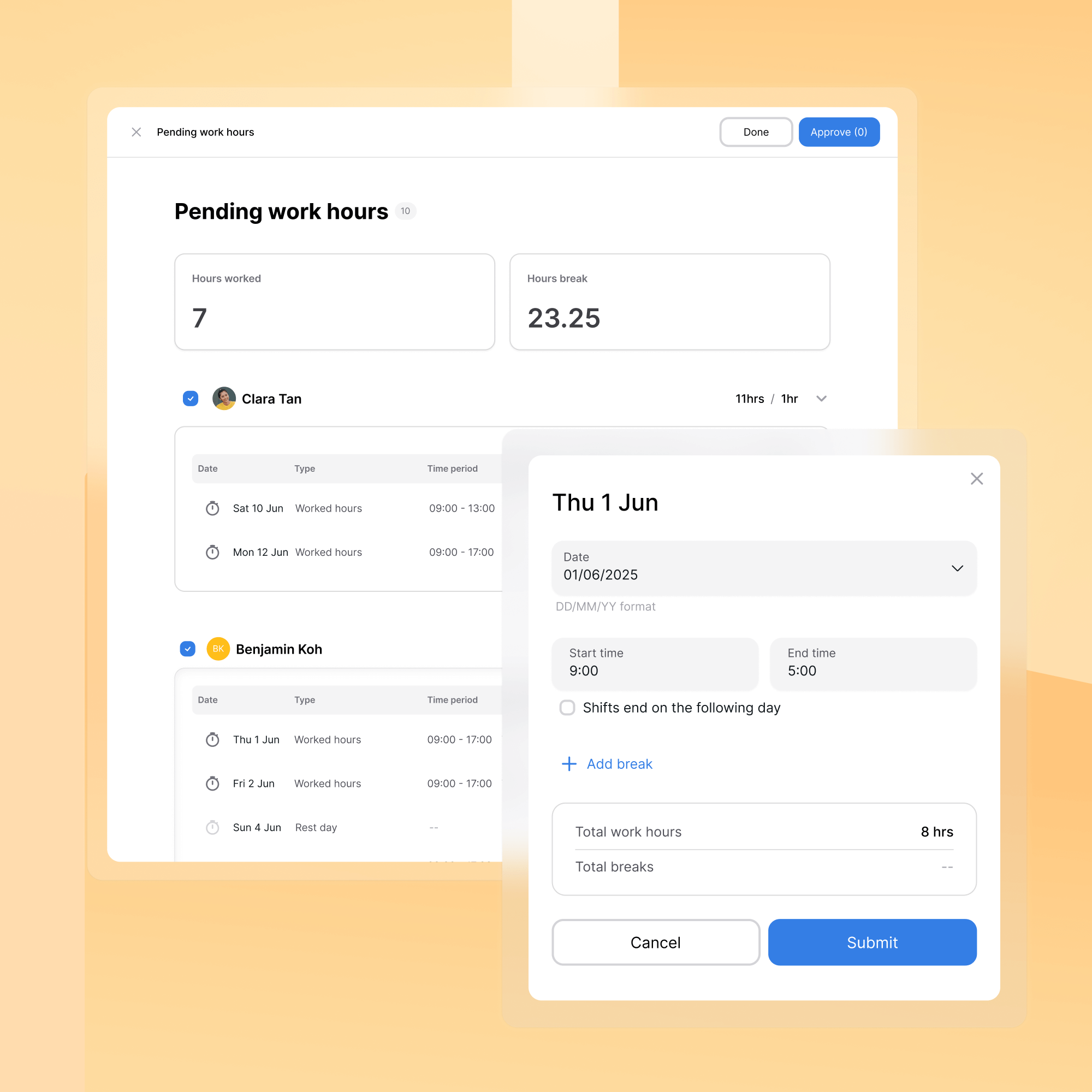 Capture working hours accurately and compliantly across multiple countries and labor laws. Country-specific validation rules prevent non-compliant entries before submission. Timesheets flow directly into payroll data, eliminating reconciliation headaches.