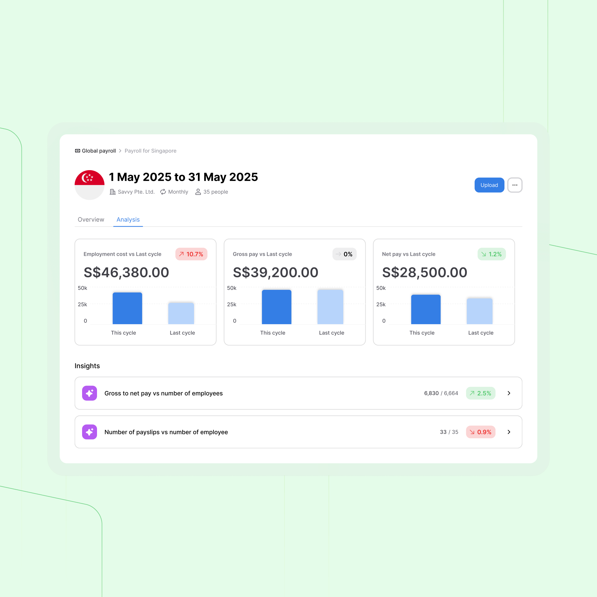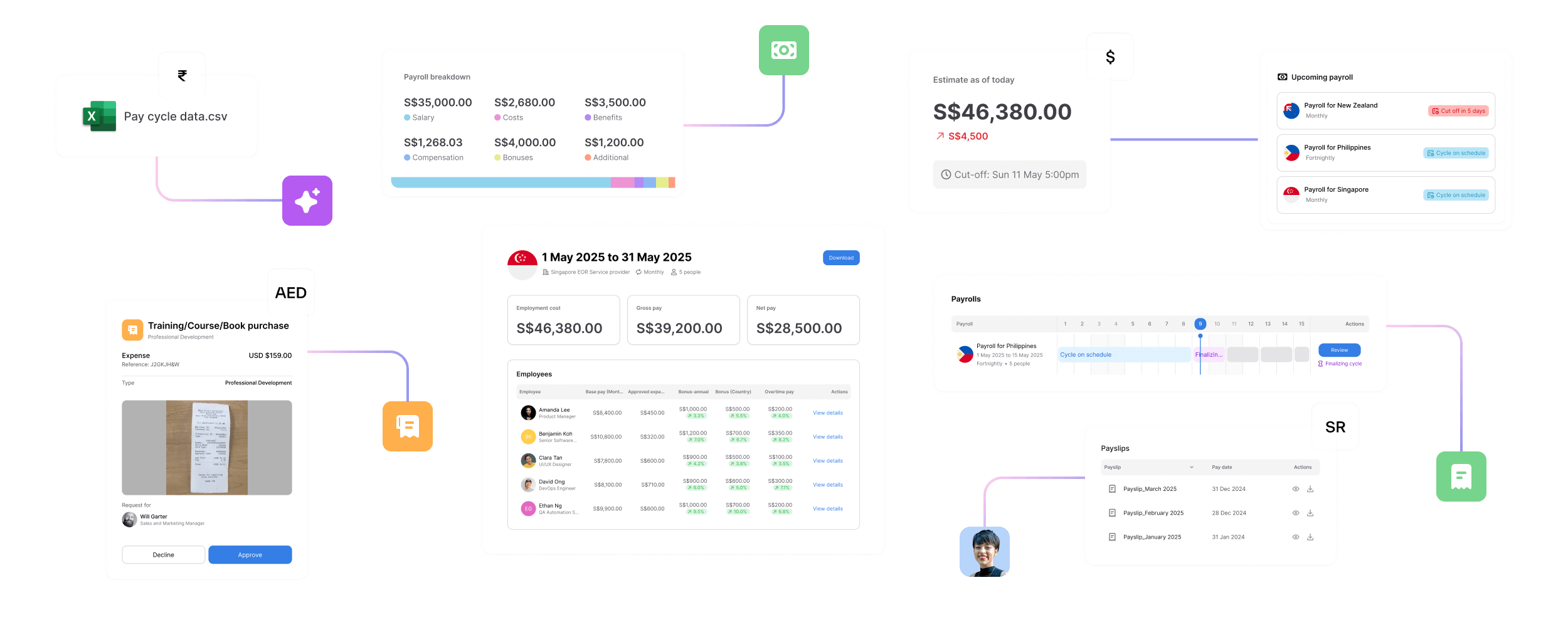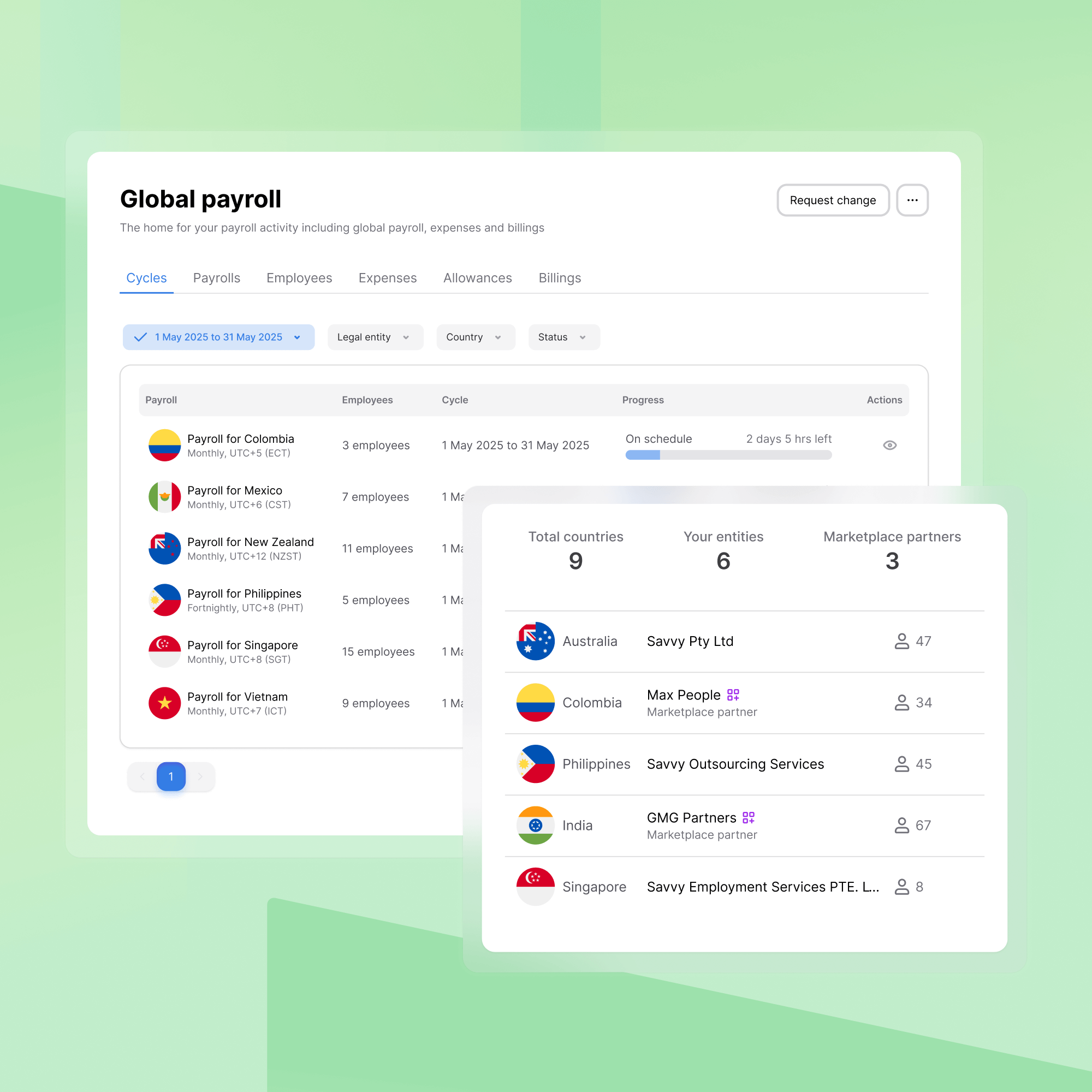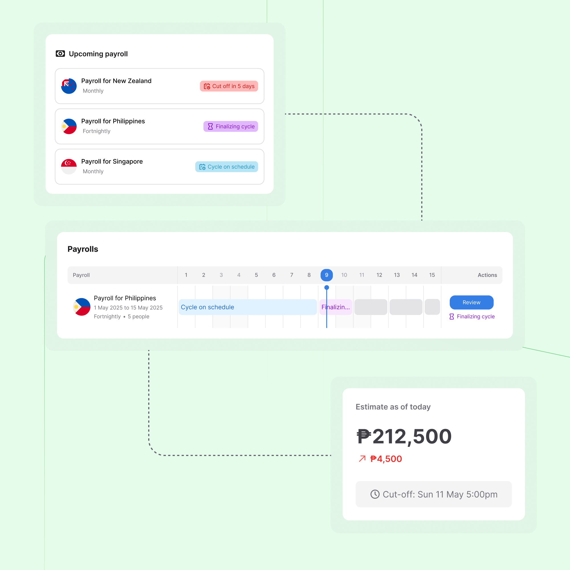 Manage all payrolls across countries in one central dashboard. Get instant visibility into payroll status, track processing milestones, and coordinate seamlessly with In-Country Providers—no more jumping between systems or spreadsheets.