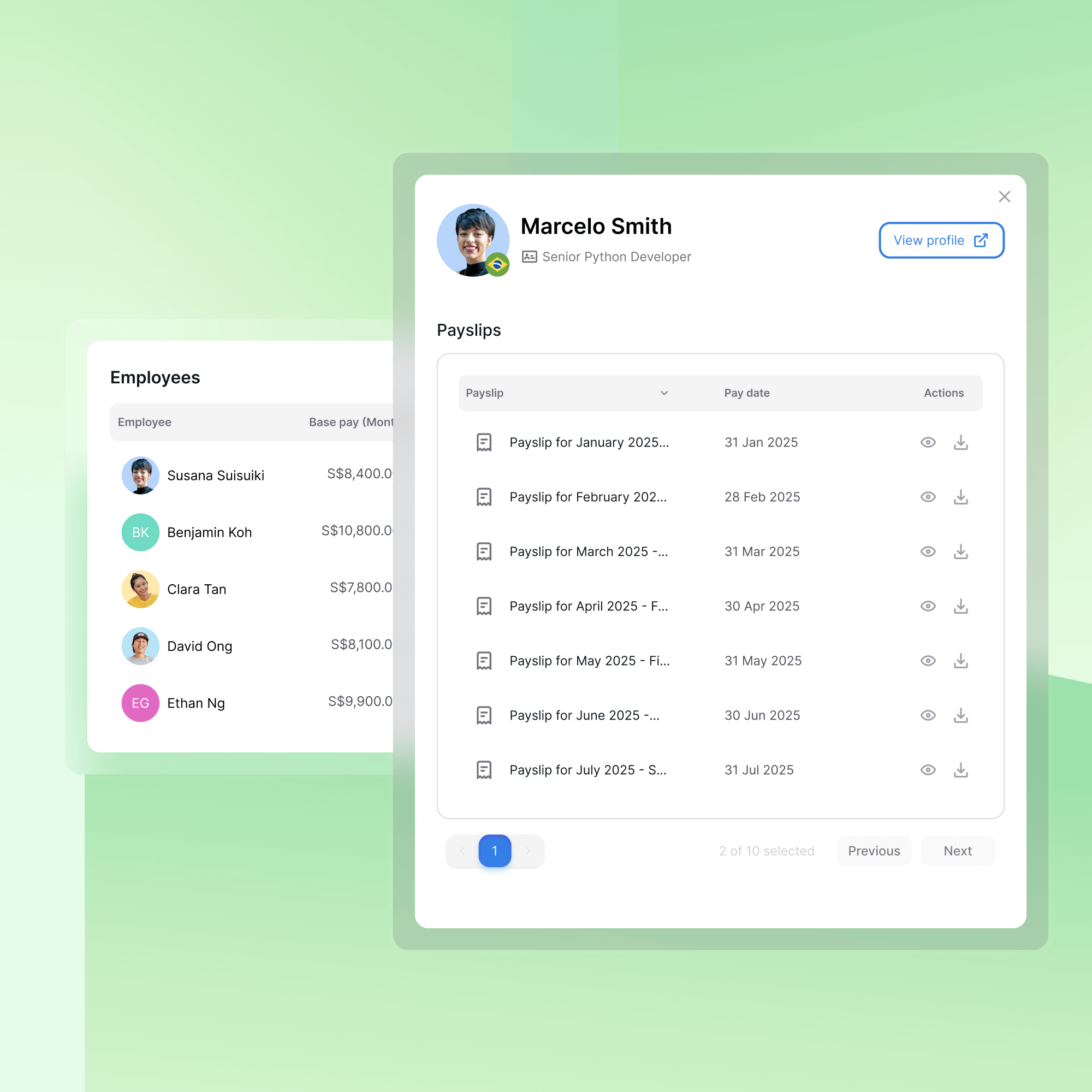 Automatically generate and distribute compliant payslips for each country, keeping you in line with local regulations, or upload your own. Support multiple languages and formats while maintaining a consistent global process.
